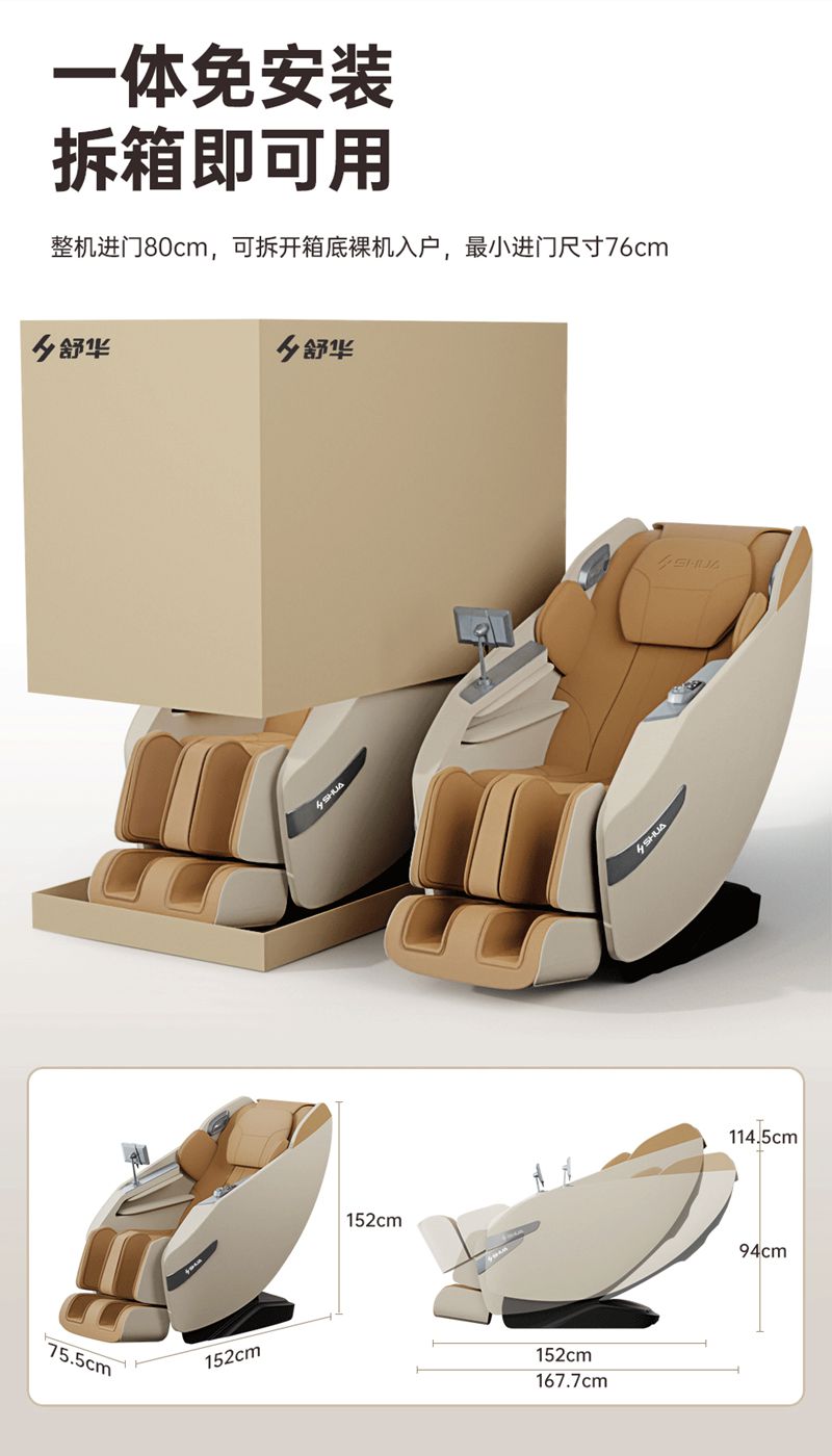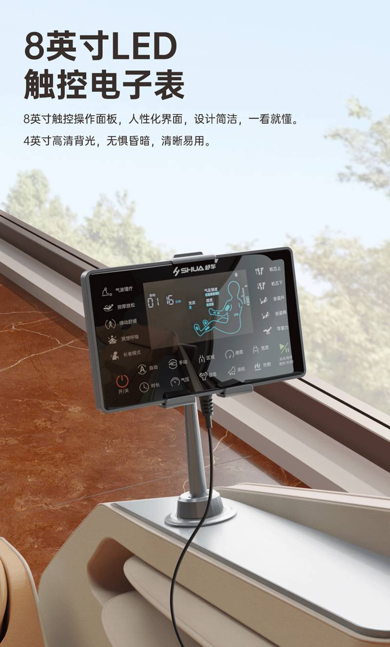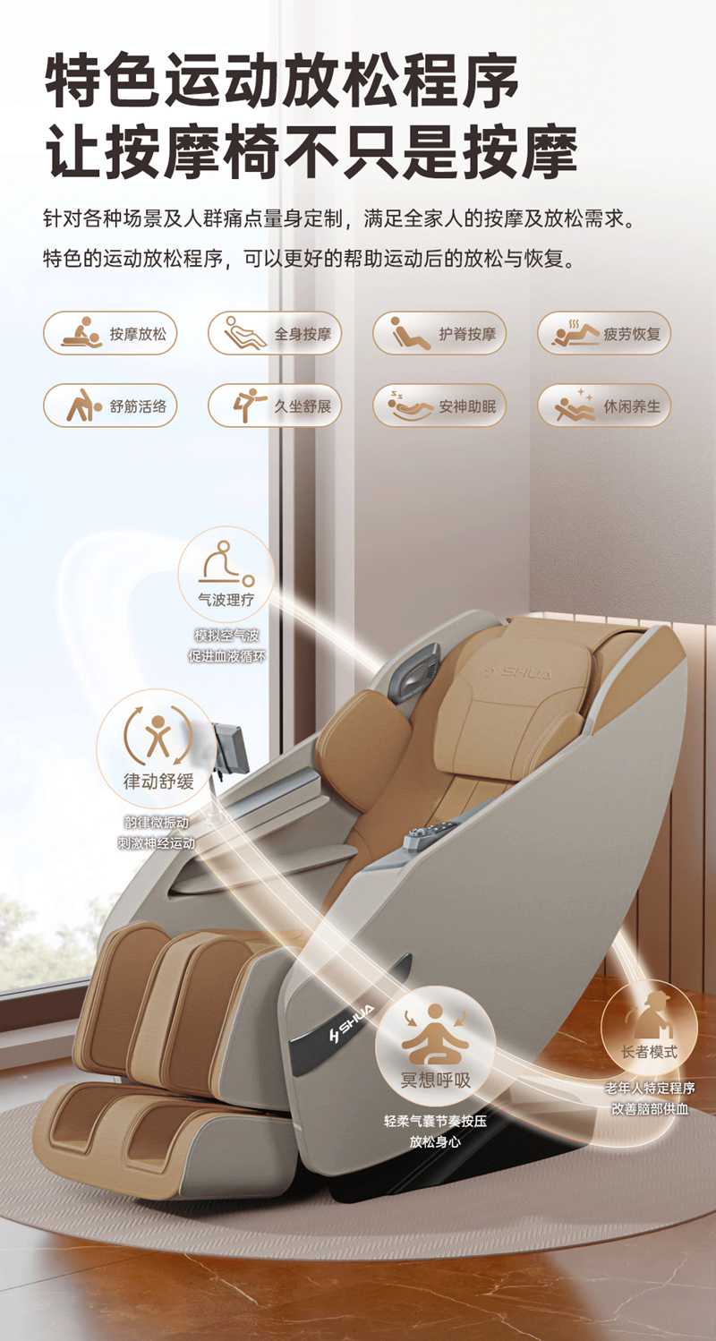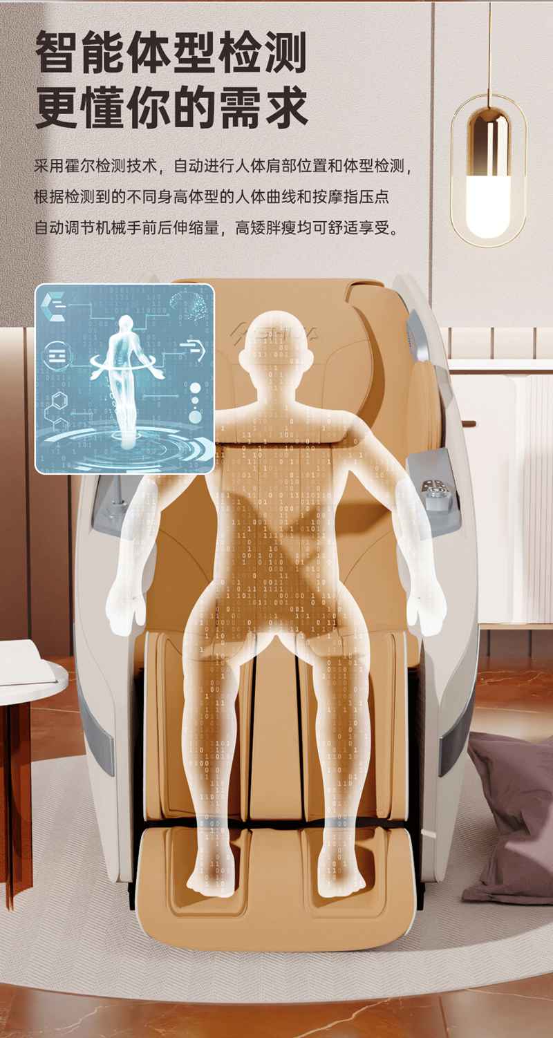 SH-M650 运动放松椅-4种运动放松特定程序,满足不同人群和场景下的需求,12种按摩程序,融合现代科技与传统按摩理念,提供精准力度和科学手法。定制135cmSL贴合7大部位27个点位,确保按摩全面深入,SL型导轨贴合人体背部曲线,提供精准舒适的按摩体验,双曲线导轨,高硬度,稳固不易变形。采用霍尔检测技术,通过多组传感器自动识别人体曲线和按摩点,机械手自动调节,适应不同身高体型,实现个性化按摩体验。