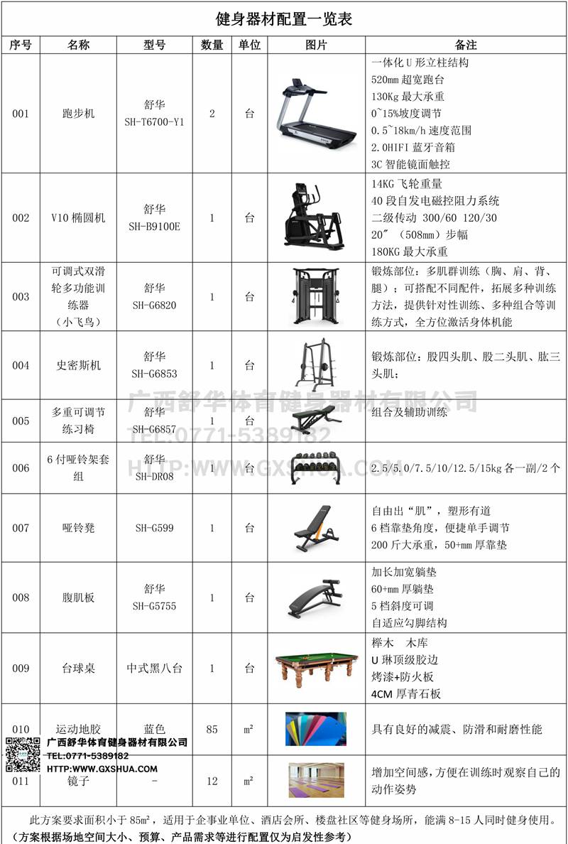 此方案要求面积小于85m²,适用于企事业单位、酒店会所、楼盘社区等健身场所,能满8-15人同时健身使用。(方案根据场地空间大小、预算、产品需求等进行配置仅为启发性参考)