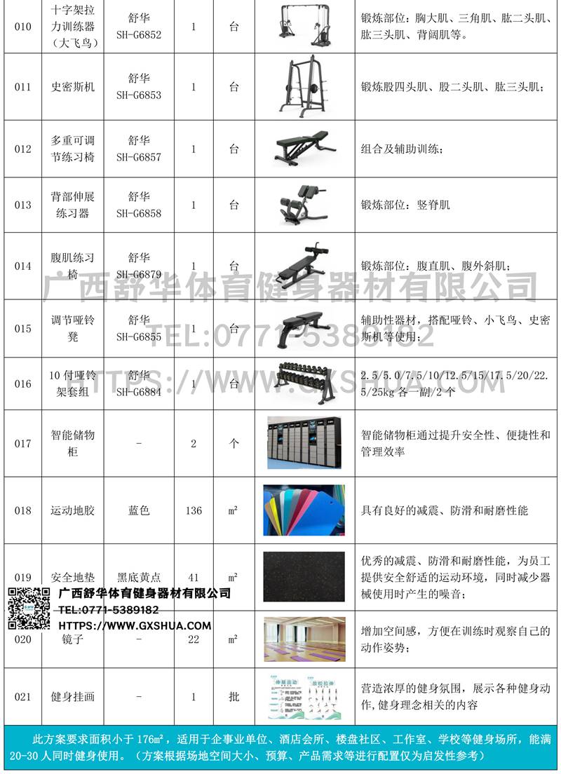 大飞鸟(1台),史密斯机(1台),多重可调节练习椅(1台),背部伸展练习器(1台),腹肌训练器(1台),10付哑铃套组(1套),可调哑铃凳(1张),可以实现对不同肌肉群的针对性训练,满足肌肉训练需求,全方位激活身体机能。
