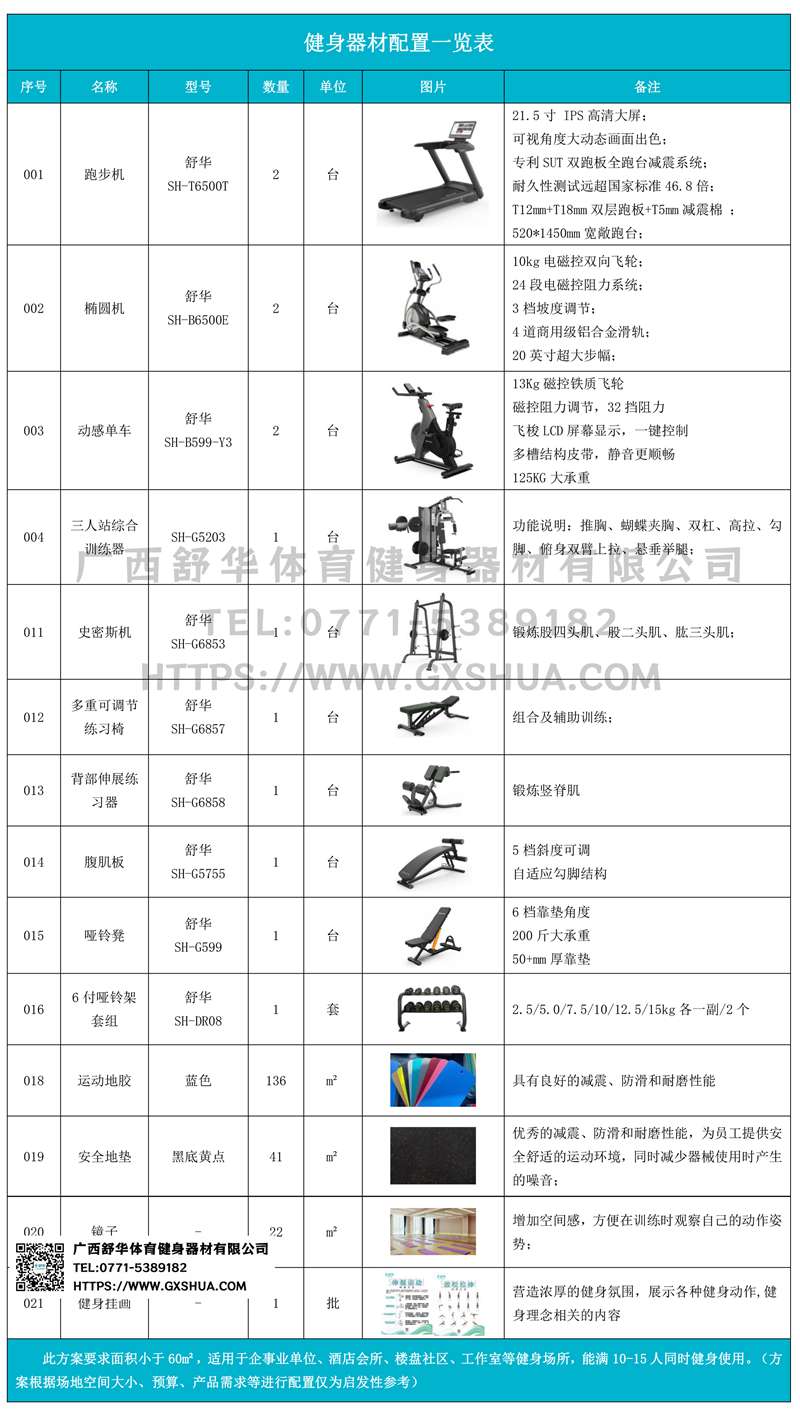 此方案要求面积小于60m²,适用于企事业单位、酒店会所、楼盘社区、工作室等健身场所,能满10-15人同时健身使用。(方案根据场地空间大小、预算、产品需求等进行配置仅为启发性参考)