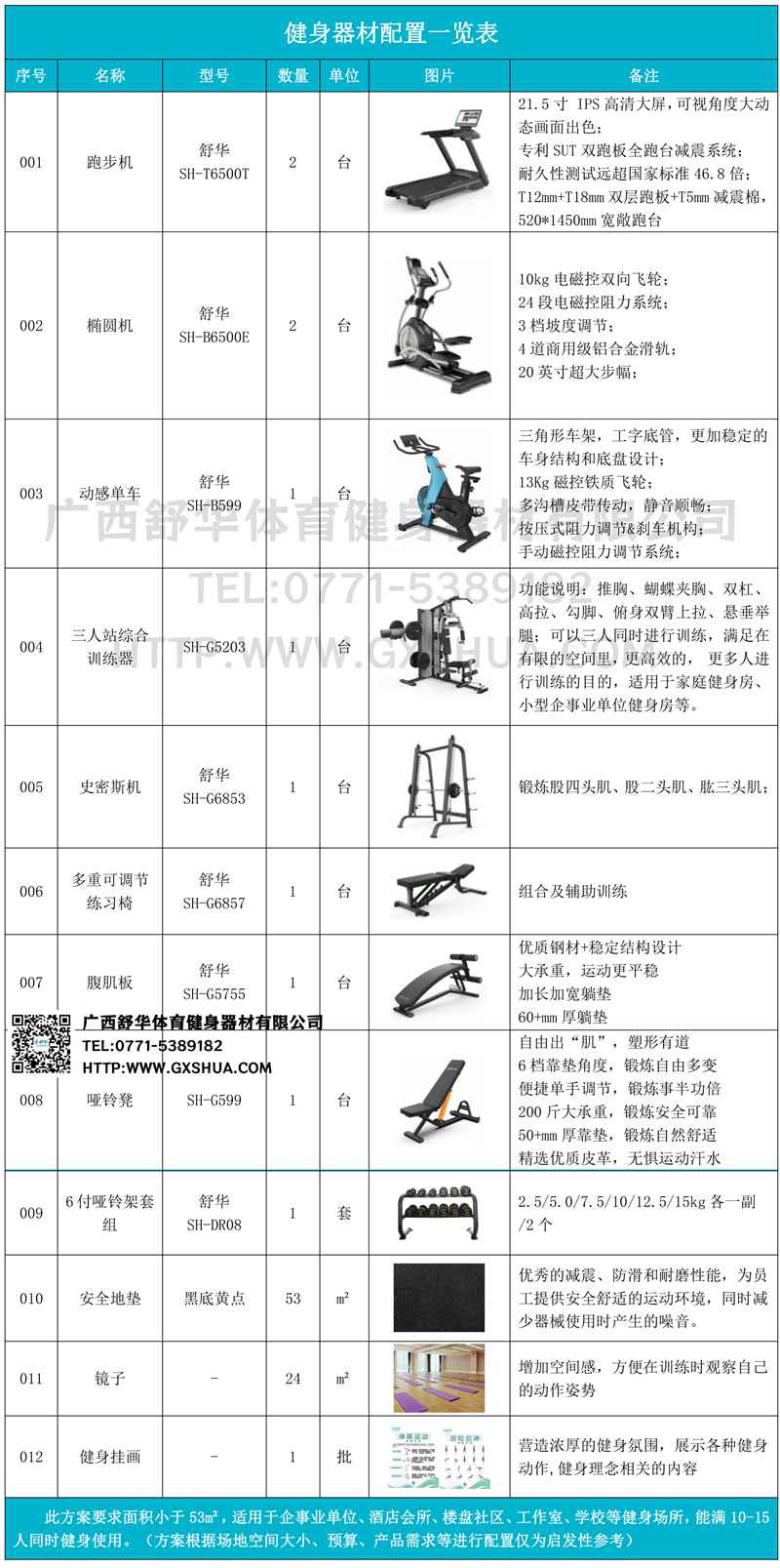 此方案要求面积小于53m²,适用于企事业单位、酒店会所、楼盘社区、工作室、学校等健身场所,能满10-15人同时健身使用。(方案根据场地空间大小、预算、产品需求等进行配置仅为启发性参考)